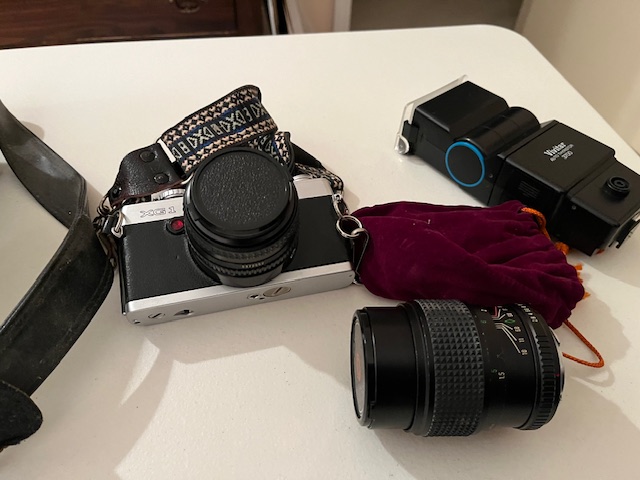 Minolta XG1 with 50mm lense, 135mm lense, and Vivitar Flash