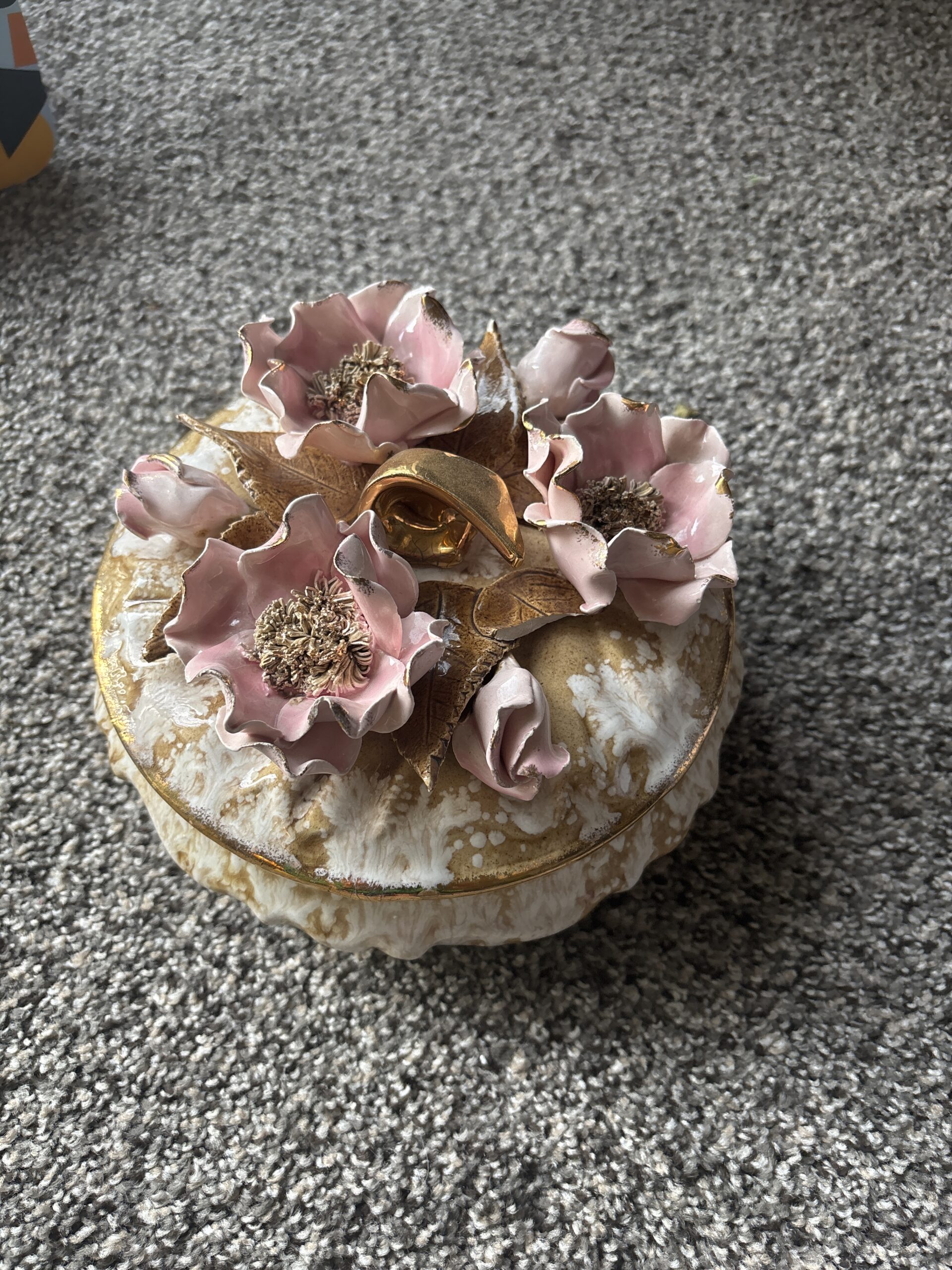 Lithos round piece can used for storage of whatever you desire 🙂 it has a very pretty design around the piece and a beautiful set of pink flowers on the top. (I think they are roses! )