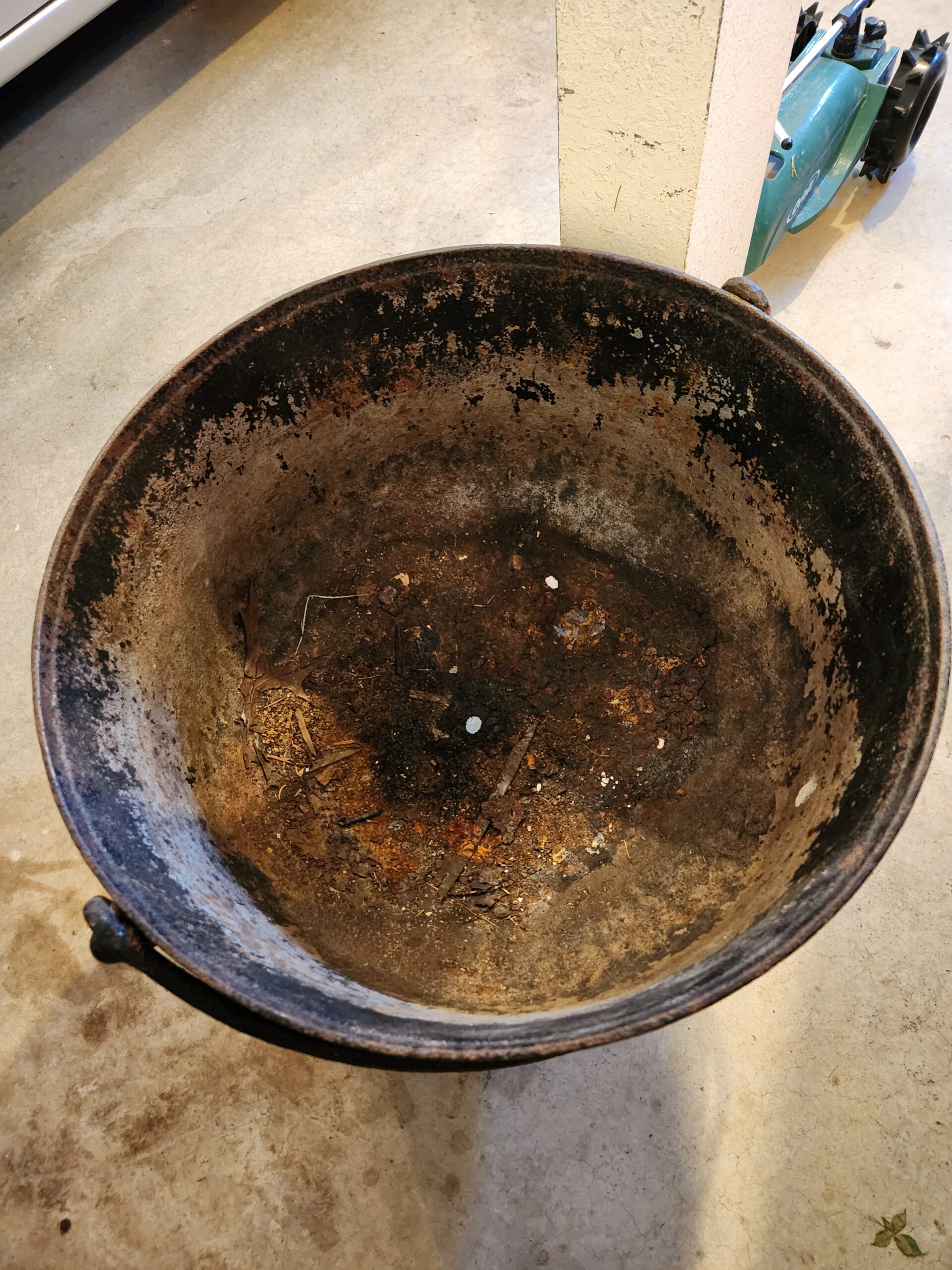Black cast iron cauldron with handle and with claw feet holding glass ball