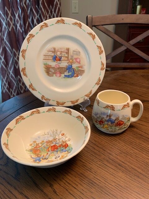 Two 3-piece sets of Royal Doulton bone china children’s dinnerware sets circa 1980 that include plate, bowl and cup. Also one 2-piece set that includes baby bowl and two-handle mug. Note one of the bowls on one of the 3-piece sets has a small chip (see photo)