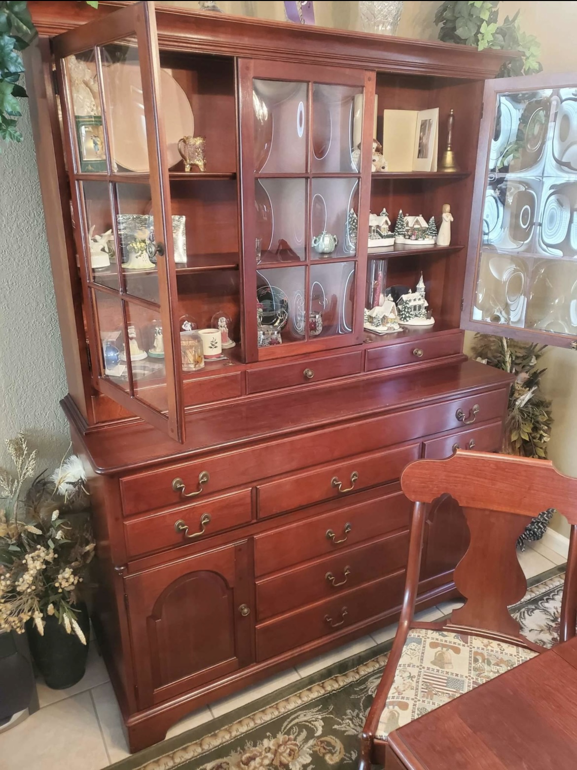 Duncan phyfe dining room table with three leaves, table pad, and six chairs- 2 which are armed. Table has brass feet and both sides offer the drop down leaf style. China hutch is two piece: top and bottom
