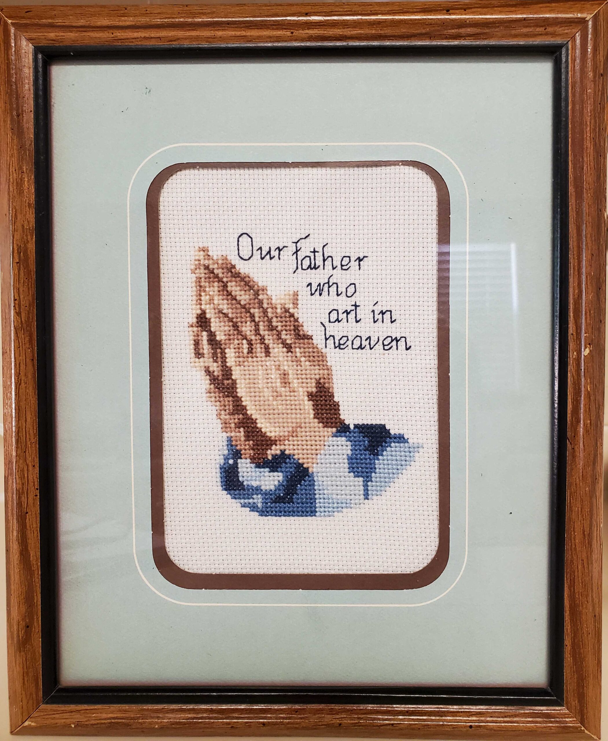 #1 Praying Hands/Our Father, needle point, wood frame 9″x11″ (bright light lines on upper right, no visible on the matting)
