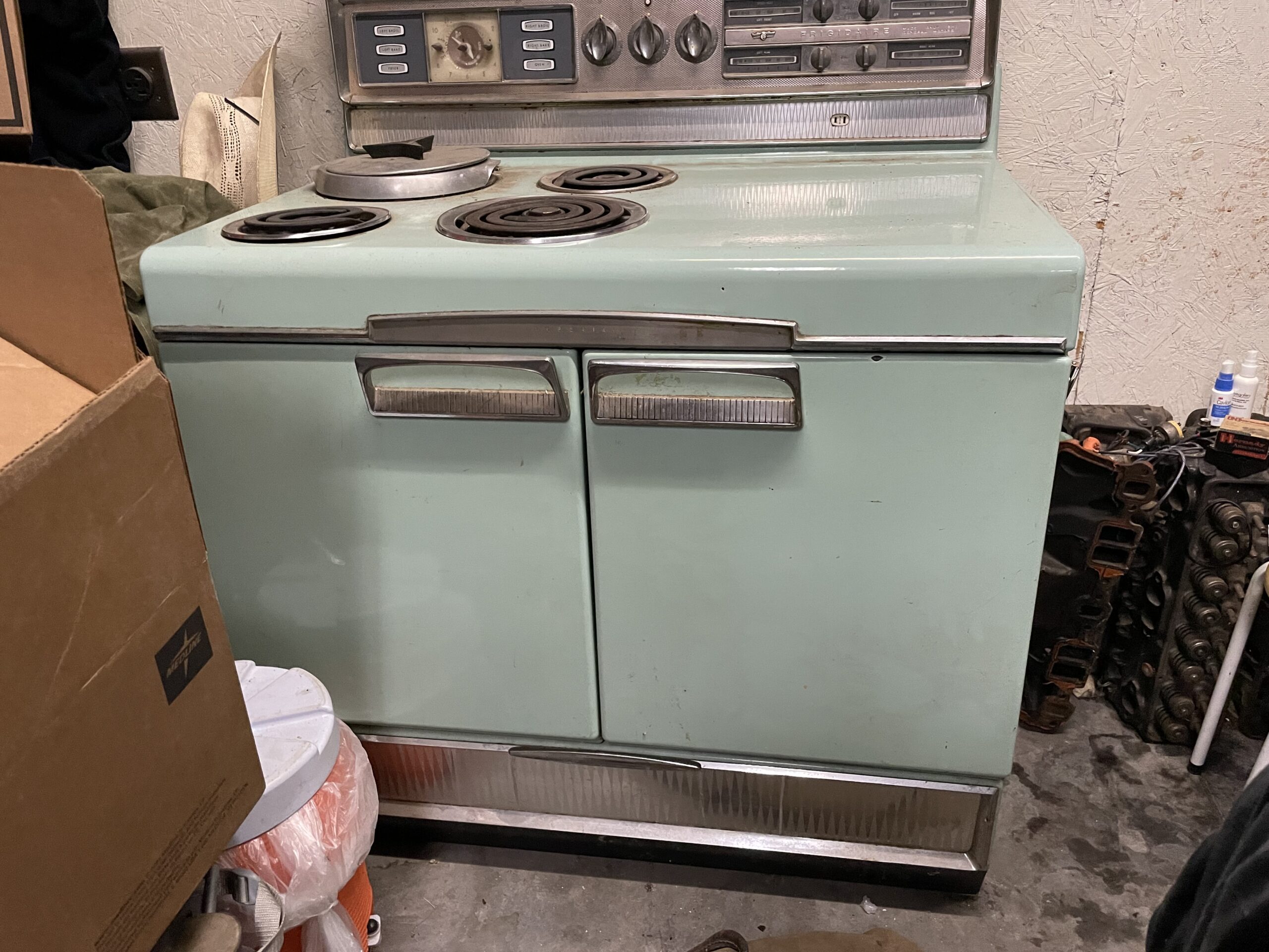 i do not know the year of this. it is robins egg blue enamel. it is electric. the stovetop is 3 regular burners and 1 large deep well pot or fryer. there are 2 ovens as well