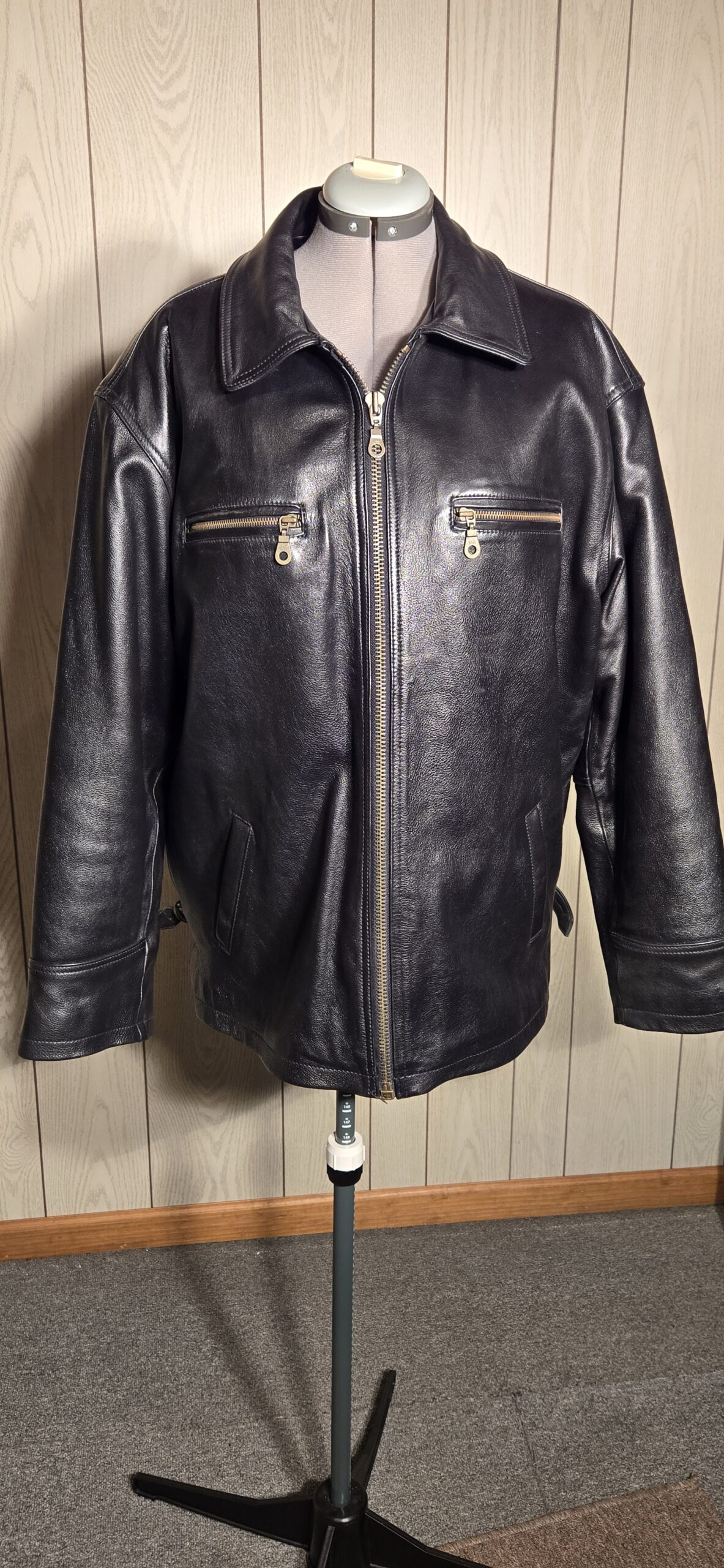 Heavyweight black leather coat. Zipper front.