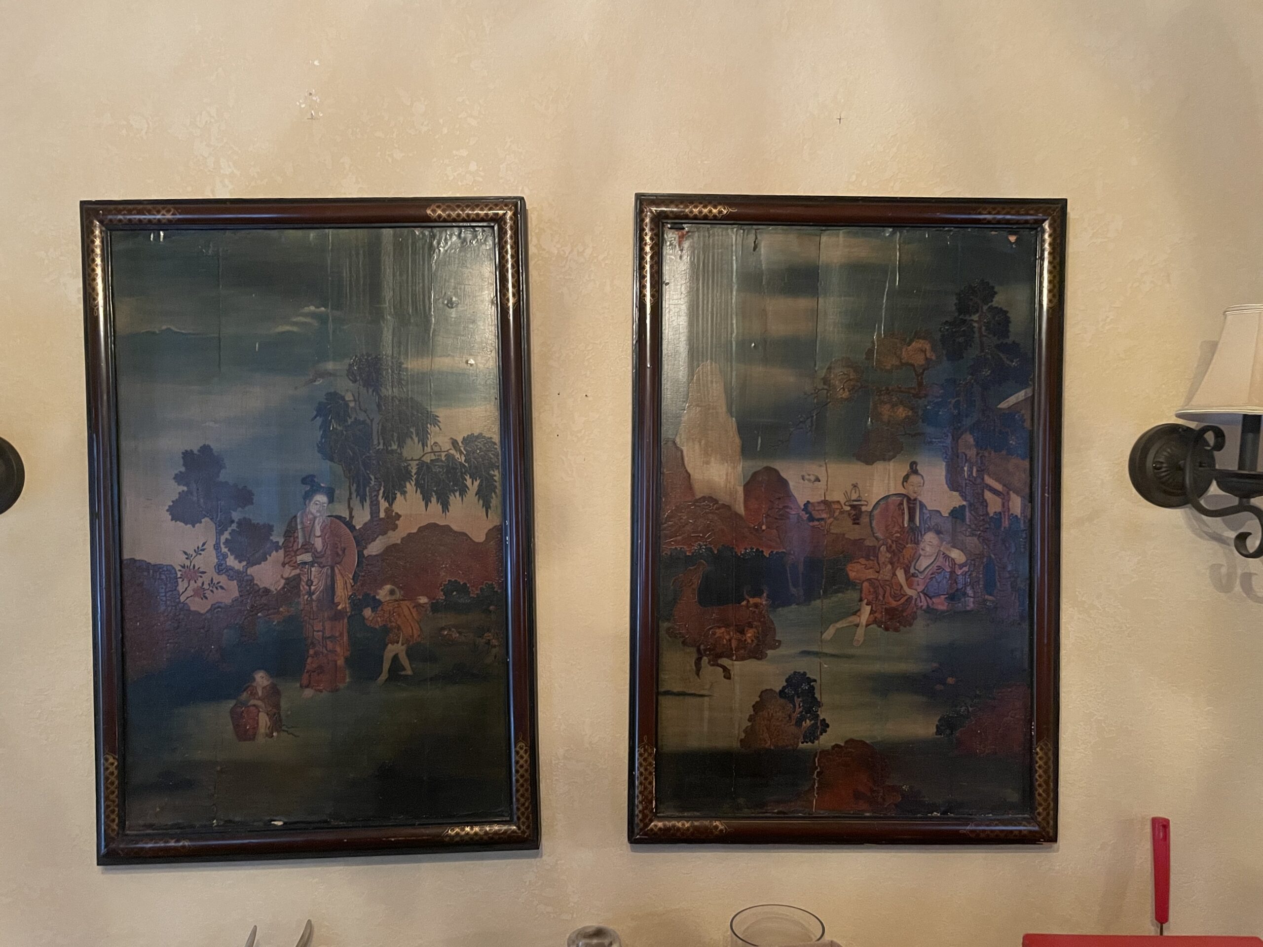 Pair of Chinese painted wooden panels measuring 33” high by 21” wide in a 1 3/4” wooden lacquer frame. One panel depicts a mother with two children and the other panel depicts a lounging man with a woman looking down on him. Early 19th Century.