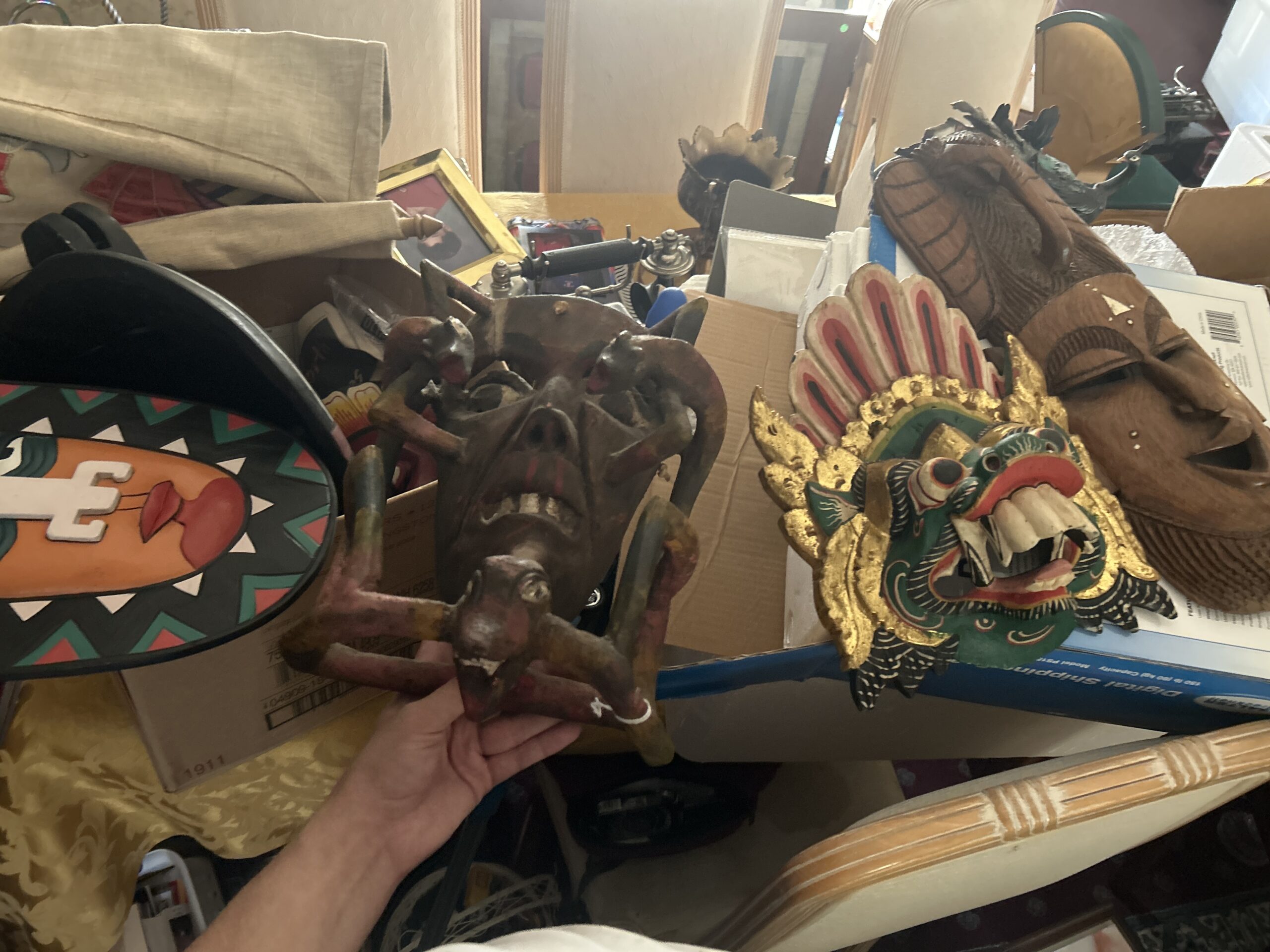 My dad died and left behind an abundance of things he bought in like 2014-2015 from an antique store in shawnee named nellie and nicos and its really taking up alot of space and i would like to sell them for cheap. Let me know if interested, theres alot of masks from different cultures like ghana, philipines, indonesia, chinese, etc id like to sell the maks based on size from 5-15 dollars each, the 2 african masks for 10, the 2 bigger masks for 15 and the rest for 5, only if youre interested of course. I have more antiques here im gonna send in another message to see if interested. Also open to negotiating as they are also taking up alot of space and id also just like to get rid of everything. There was a guy in west bottoms interested but he bailed