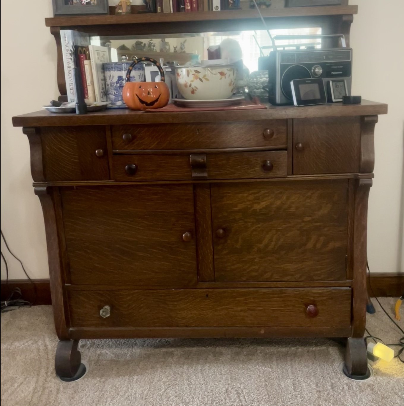 1940s era. Very good condition for its age. Tiger wood design on some surfaces. Three drawers, four cabinets, inset mirror below shelf. Dimensions are 46″ wide x 20″ deep x 53.5 inches high.