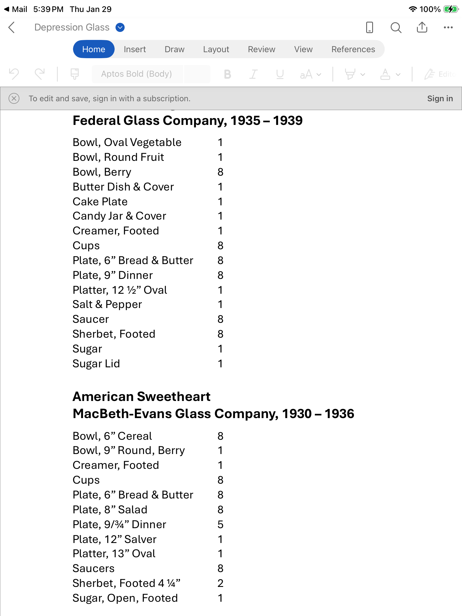 I’m in the process of selling my depression glass that I’ve acquired over the years. Attached is an inventory list, as well as photographs of the glass. Please let me know if you are interested in purchasing.