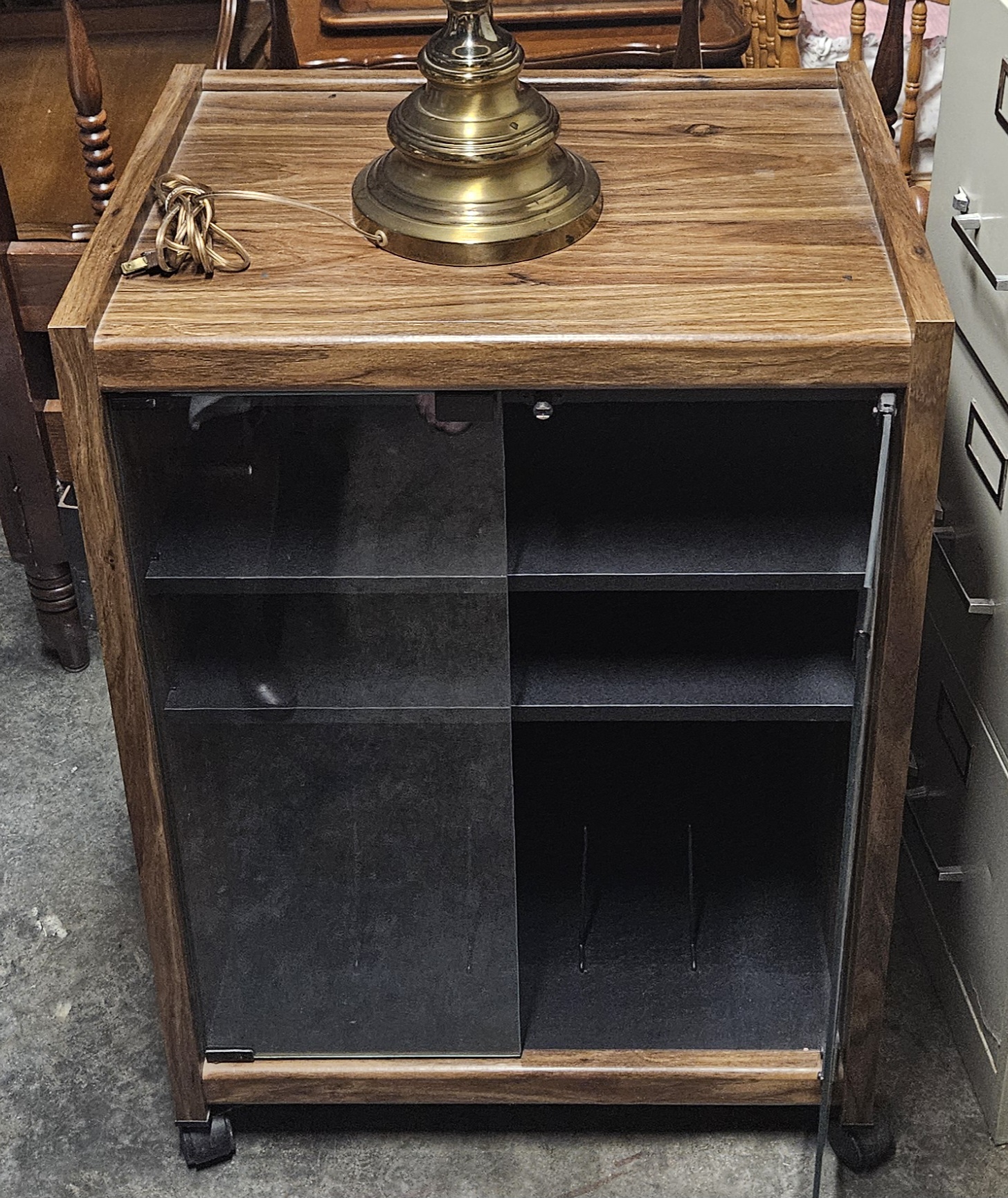 Smoke glass, double door stereo cabinet on wheels. Two shelf space for multiple components, + ample bottom shelf for albums.